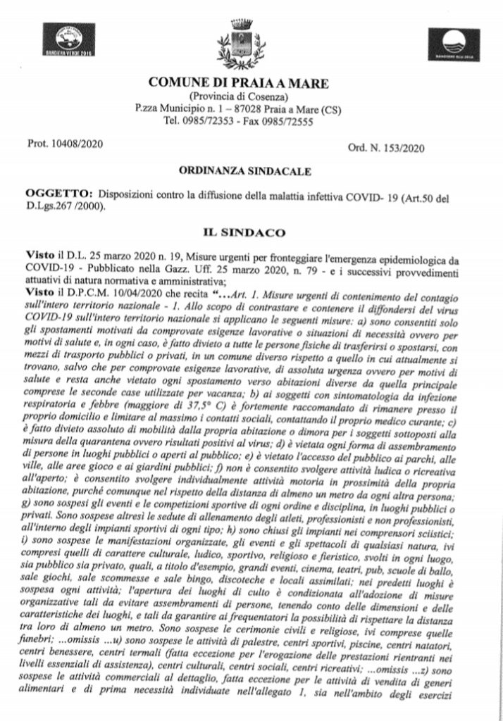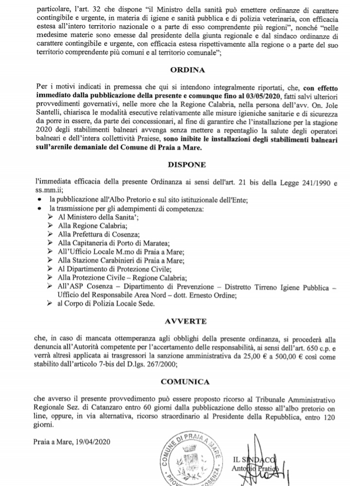 Nonostante l’apertura di Jole Santelli, il sindaco del comune tirrenico di Praia a Mare, Antonio Praticò, ha emanato un’ordinanza (N.153) che blocca l’installazione degli stabilimenti balneari fino a quando non verranno rese note le modalità operative. “Con effetto immediato e comunque fino al 03/05/2020”, sono inibite le installazioni degli stabilimenti balneari sull’arenile demaniale del Comune di Praia a Mare. fatti salvi ulteriori provvedimenti governativi, nelle more che la Regione Calabria, nella persona dell’avv. On. Jole Santelli, chiarisca le modalità esecutive relativamente alle misure igieniche sanitarie e di sicurezza da porre in essere, da parte dei concessionari, al fine di garantire che l’installazione per la stagione 2020 degli stabilimenti balneari avvenga senza mettere a repentaglio la salute degli operatori balneari e dell’intera collettività praiese”