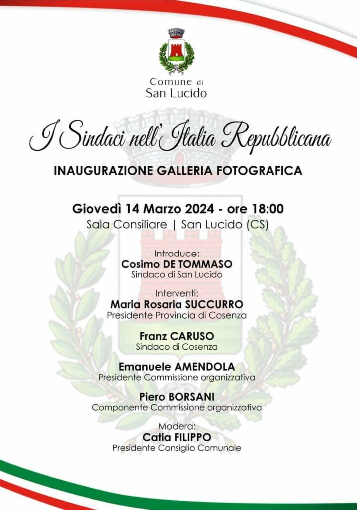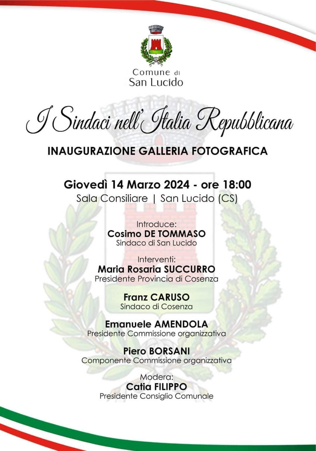 SAN LUCIDO- I Sindaci nell’Italia Repubblicana. Si terrà nella sala consiliare del comune di San Lucido, Giovedì 14 Marzo alle ore 18:00, l’inaugurazione della galleria fotografica alla presenza di ospiti e relatori illustri.