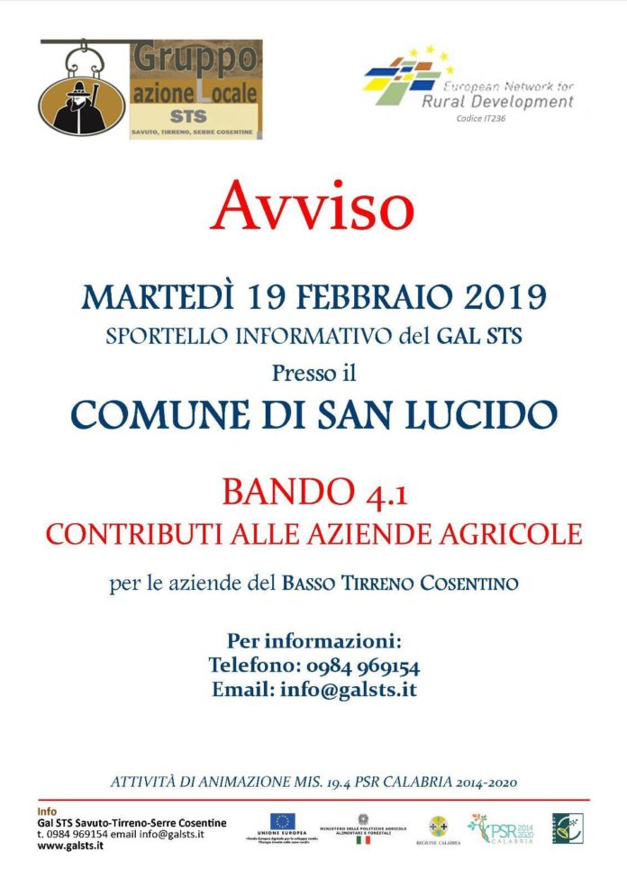 Martedí 19 Febbraio presso il comune di San Lucido, verrá inaugurato lo sportello informativo del GAL STS, L’ente del gruppo azione locale Savuto-Tirreno-serre cosentine.