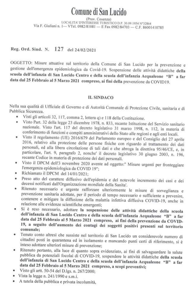 Il comune di San Lucido comunica, nuove Misure attuative sul territorio del Comune di San Lucido per la prevenzione e gestione dell’emergenza epidemiologica da Covid-19.
