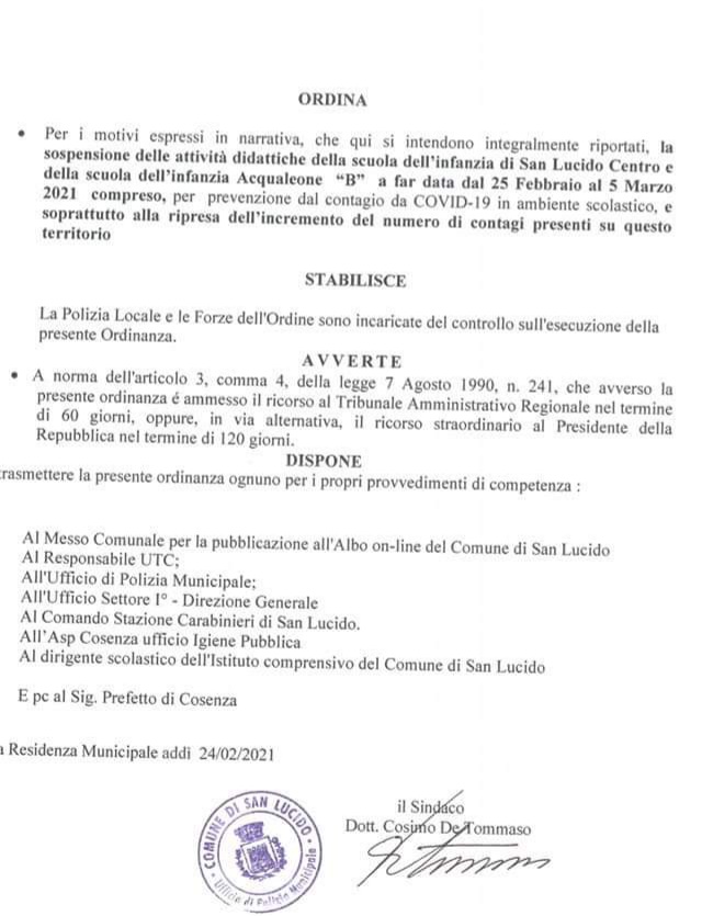 Il sindaco ha disposto la sospensione delle attività didattiche della scuola dell’infanzia di San Lucido Centro e