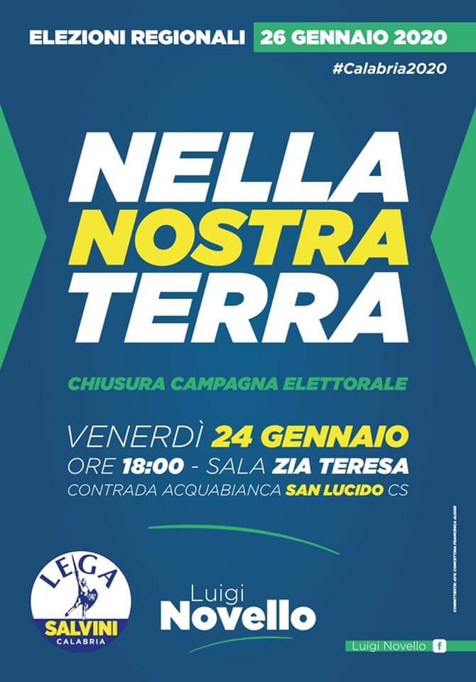 “Abbiamo deciso di chiudere la campagna elettorale tra la nostra gente. Tutti insieme, in un unico e grande abbraccio” Ad affermarlo è Luigi Novello, capogruppo di maggioranza del comune di San Lucido e candidato, molto quotato, Leghista per il rinnovo del consiglio regionale.