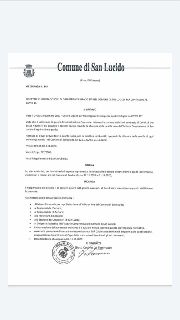 In via esclusivamente precauzionale, il Sindaco di San Lucido, dott. Cosimo De Tommaso ha ordinato (Ordinanza n.345) così come in altri comuni della provincia, la chiusura temporanea di tutte le scuole di ogni ordine e grado.
