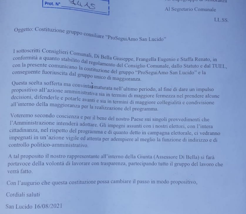 “I sottoscritti Consiglieri Comunali, Di Bella Giuseppe, Frangella Eugenio, e Staffa Renato, con la presente comunicano la costituzione del gruppo “ProSeguiAmo San Lucido”e la conseguente fuoriuscita dal gruppo unico di maggioranza”.