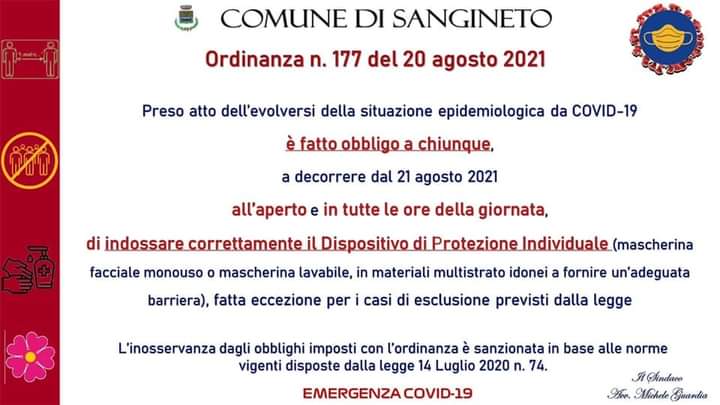 Anche a Sangineto sono state rafforzate le norme anti-covid 19. Il sindaco Michele Guardia ha pubblicato un’ordinanza con la quale dispone l’obbligo di mascherine anche all’aperto sul territorio comunale per tutto il giorno. L’ordinanza entrerà in vigore da domani.