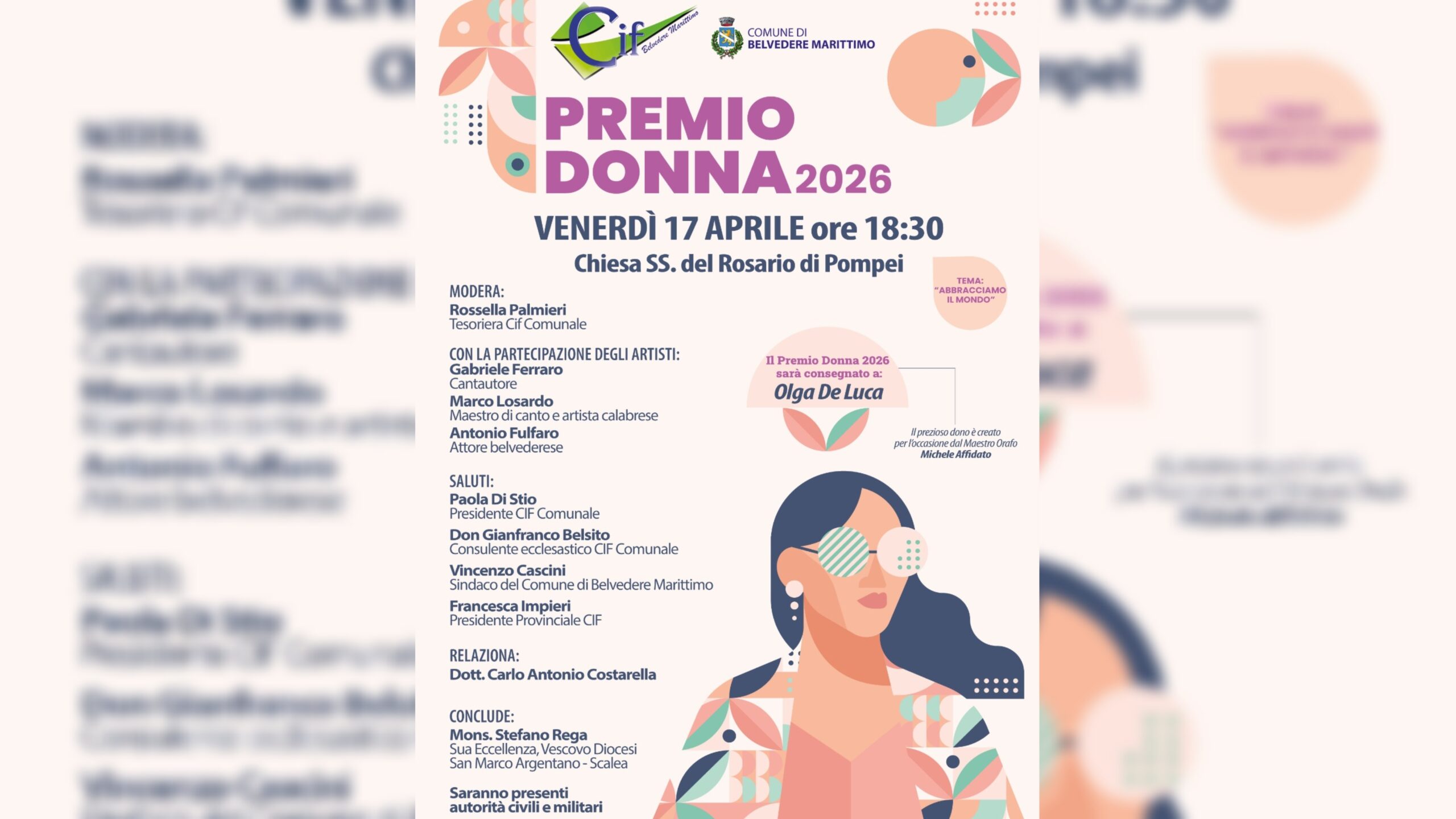 Belvedere Marittimo si appresta a vivere un momento di profonda riflessione e celebrazione in occasione del Premio Donna 2026, un evento di alto profilo sociale e culturale patrocinato dal Comune e organizzato dal CIF (Centro Italiano Femminile). L’appuntamento è fissato per venerdì 17 aprile alle ore 18:30 presso la suggestiva cornice della Chiesa SS. del Rosario di Pompei, dove i riflettori si accenderanno sul tema “Abbracciamo il mondo”, un monito alla solidarietà e all’accoglienza in un’epoca che ne sente estremo bisogno. Il cuore della serata sarà la consegna del prestigioso riconoscimento a Olga De Luca, figura scelta per il suo contributo e il suo impegno; a rendere ancora più speciale l’onorificenza sarà il dono realizzato per l’occasione dal celebre Maestro Orafo Michele Affidato, eccellenza calabrese nota a livello internazionale. La serata, moderata da Rossella Palmieri, Tesoriera del CIF Comunale, vedrà l’alternarsi di momenti istituzionali, artistici e di approfondimento. Il programma prevede i saluti di Paola Di Stio, Presidente del CIF Comunale, di Don Gianfranco Belsito, del Sindaco Vincenzo Cascini e della Presidente Provinciale del CIF Francesca Impieri. Il dibattito entrerà nel vivo con la relazione del Dott. Carlo Antonio Costarella, mentre le conclusioni saranno affidate a Sua Eccellenza Mons. Stefano Rega, Vescovo della Diocesi San Marco Argentano – Scalea. Ad arricchire l’atmosfera non mancheranno le performance artistiche del cantautore Gabriele Ferraro, del maestro di canto Marco Losardo che comporrà un mosaico di emozioni in musica. Alla manifestazione è prevista inoltre la partecipazione delle massime autorità civili e militari, a testimonianza dell’importanza di un premio che non celebra solo una singola persona, ma l’intero valore del ruolo femminile nella società contemporanea.