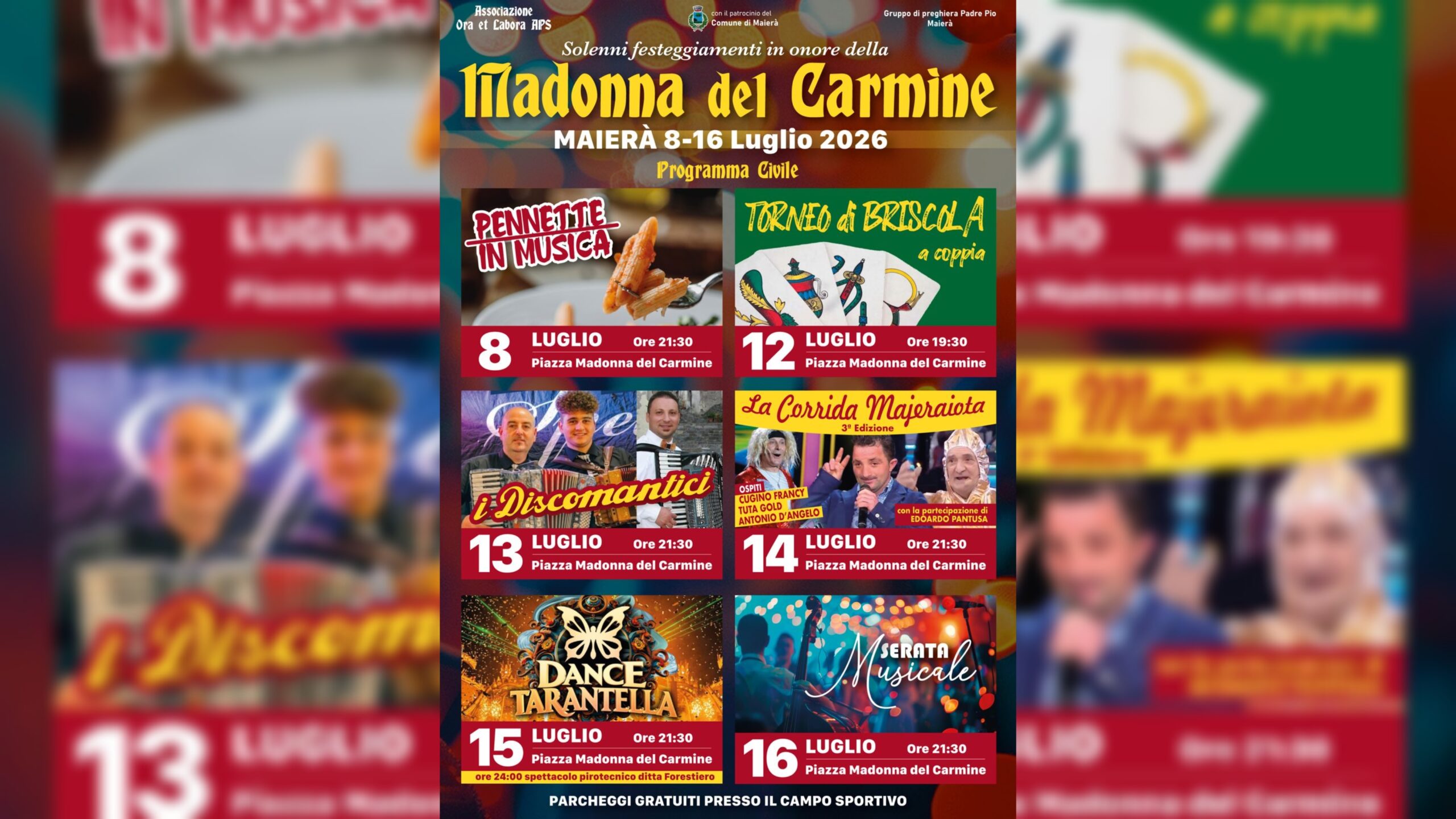 Dall’8 al 16 luglio 2026, il Programma Civile curato dall’Associazione Ora et Labora APS — con il patrocinio del Comune di Maierà e la collaborazione del Gruppo di Preghiera Padre Pio — offrirà un calendario ricco di appuntamenti che spaziano dalla gastronomia allo spettacolo popolare.