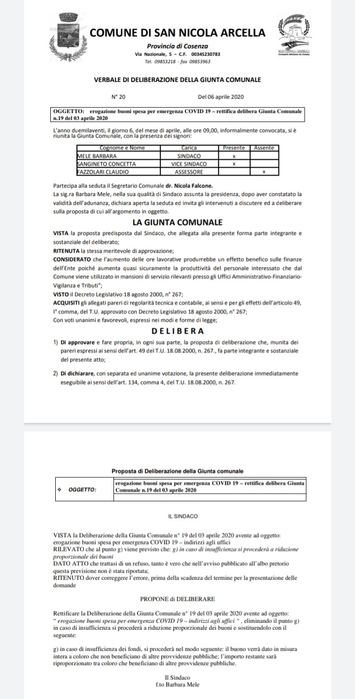 “Si porta a conoscenza che sono pervenute 123 istanze per l’erogazione di buoni spesa relativi all’emergenza COVID 19. Per la distribuzione degli stessi sarà data priorità alle prime 68 domande presentate da nuclei familiari più numerosi e con figli di età fino a 12 anni e da coloro che non godono di altre forme di sostegno, come da deliberazione di GM n.19 del 03/04/2020. Le restanti 55 saranno prese in considerazione non appena saranno accreditati ulteriori fondi da parte di Enti sovracomunali. I beneficiari saranno contattati telefonicamente per il ritiro dei buoni dall’ufficio Servizi Sociali”.